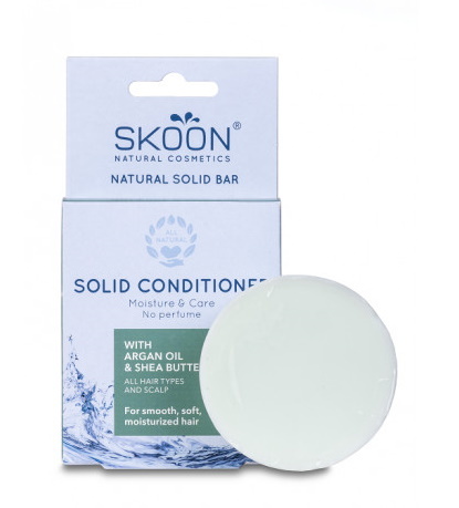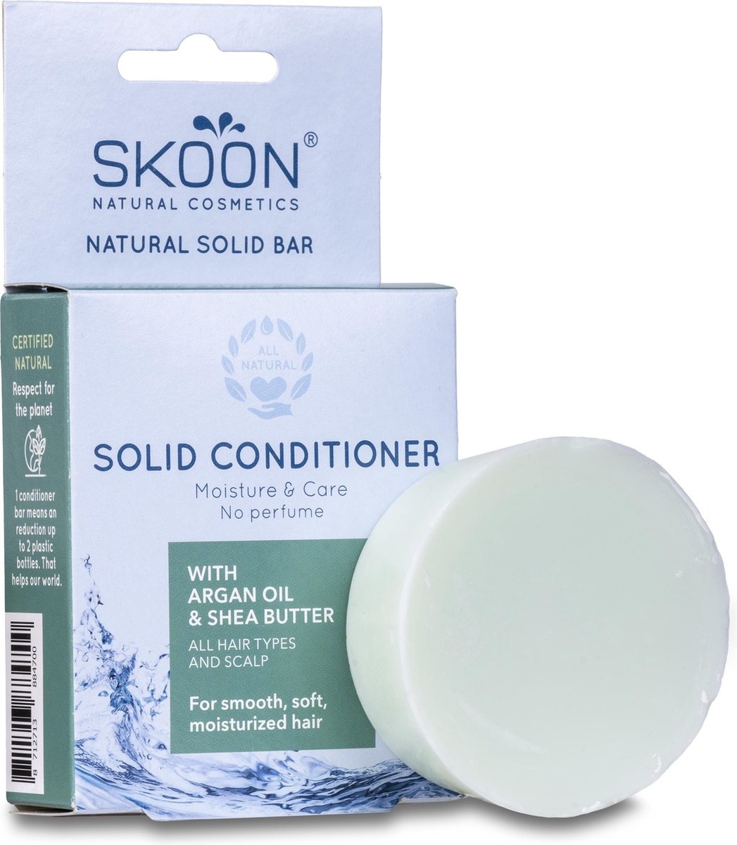 De Solid Conditioner Moisture & Care van Skoon is een vaste conditioner zonder parfum. Geschikt voor alle haartypes, ook voor droog en gekleurd haar en bij een droge hoofdhuid. Arganolie en sheabutter zorgen voor een intensieve hydratatie van het haar.