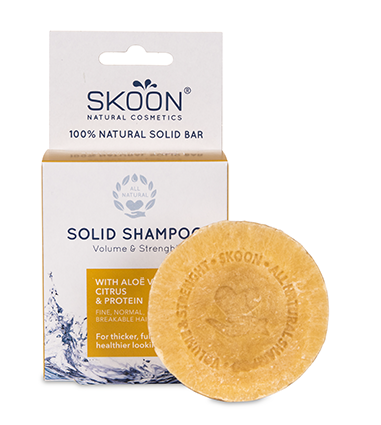De Solid Shampoo Volume & Strength van Skoon is een 100% natuurlijke vaste shampoo voor normaal, fijn en breekbaar haar. Maakt het haar sterker en zorgt voor meer volume. De shampoobar is supergeconcentreerd, zonder toegevoegd water of overbodige stoffen. Herstellende proteïne, hydraterende aloë vera en stimulerende citrus geven je haar extra energie. Bevat verder o.a. sheabutter, jojoba olie en extracten van gemberlelie, abrikoos, wortel en frangipani. De Solid Shampoo Volume & Strength is vegan.