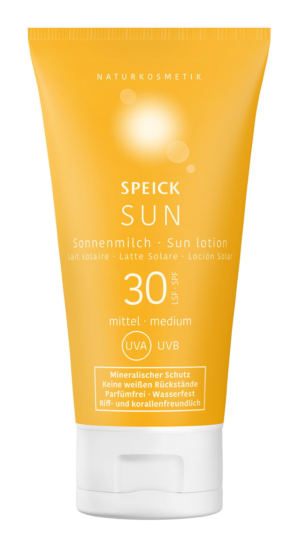 De Sun Lotion SPF30 van Speick is een natuurlijke minerale zonbescherming voor gezicht en lichaam. De zonnebrandlotion biedt een betrouwbare, directe bescherming tegen UVA- en UVB-straling dankzij zinkoxide (vrij van nano-deeltjes). De Sun Lotion SPF30 trekt snel in, is watervast en laat geen witte waas achter op de huid. De lotion hydrateert de huid intensief met suikerbiet-extract en kalmeert de huid met rietextract en granaatappel extract. Bevat verder o.a. extracten van rijstkiemolie, Speick plant, zwarte netel en Kakadu pruim. De zonnebrandlotion is parfumvrij en is ook ideaal voor kinderen. Vegan.