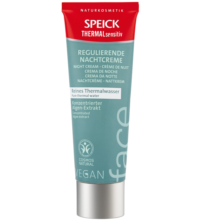 De Thermal Sensitiv Nachtcrème van Speick is een rijke, voedende nachtcrème die de huid 's nachts reguleert en 's morgens heerlijk doet aanvoelen. Ook ideaal als een rijke, voedende dagcrème. Thermaal water uit de minerale bronnen van Schlangenbad bevat kiezelzuur. Biologische zonnebloemolie, en biologische sheabutter voeden, hydrateren en versterken en zorgen voor een soepele, zachte huid. Biologische aloë vera hydrateert intensief, werkt ontstekingsremmend en stimuleert het herstellend vermogen van de huid. Betaïne verzacht, hydrateert en zorgt voor een gladdere huid. Biologische camelia olie maakt de huid zacht en elastisch en vermindert irritaties. Extract van de Speick plant kalmeert, revitaliseert en harmoniseert. Bruin alg extract is rijk aan aminozuren, antioxidanten, vitaminen en mineralen. Het stimuleert de huidregeneratie en huidgezondheid en bevordert de vochtbalans van de huid. De nachtcrème bevat verder o.a. vitamine E en F, sorbitol en extracten van o.a. suikerbiet, rozemarijn, riet en Poria Cocos (Aziatische paddenstoel).