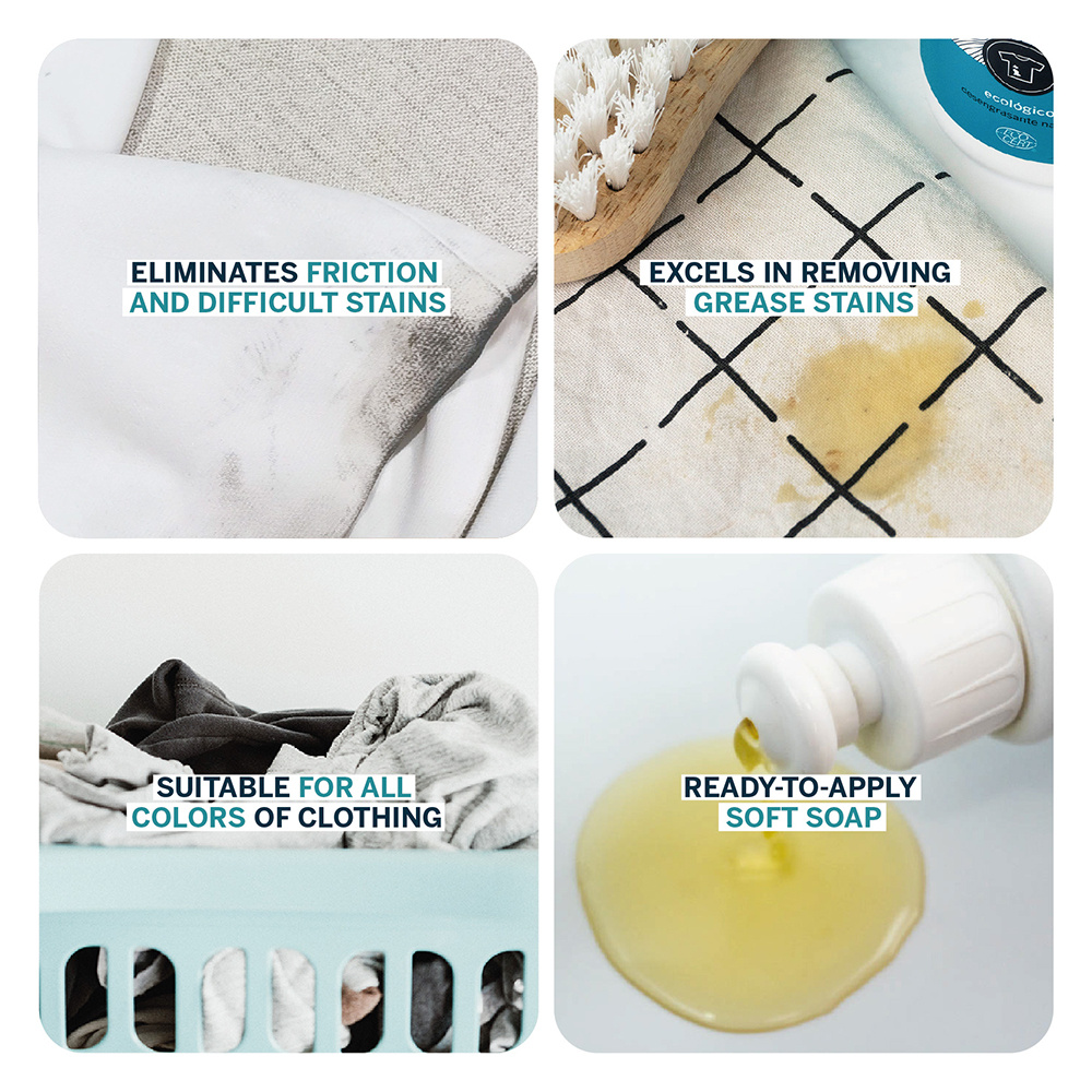 Zachte zeep voor gemakkelijk gebruik. Doeltreffende vlekkenverwijderaar op basis van plantaardige oliën.
