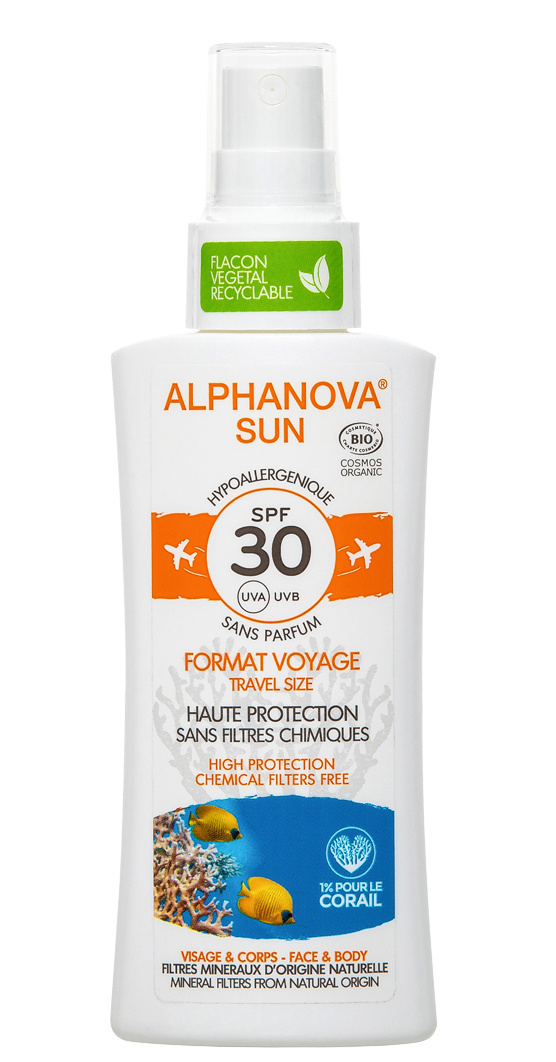 De SUN Hypoallergeen Zonnebrandspray SPF30 van Alphanova is een hypoallergene, natuurlijke zonnebrandspray voor de gevoelige en reactieve huid. De lichte formule heeft een niet-plakkerige textuur, is waterproof en bevat geen parfum of zinkoxide. De lotion biedt een hoge bescherming voor UVA- en UVB-straling. Verrijkt met biologische aloë vera en biologische oliën van jojoba en tamanu. De spray heeft geen negatief effect op het leven in zee en in riffen en is 100% biologisch afbreekbaar. De verpakking is gemaakt van bioplastic dat afkomstig is van suikerriet en de ecologische voetafdruk is gelijk aan nul.