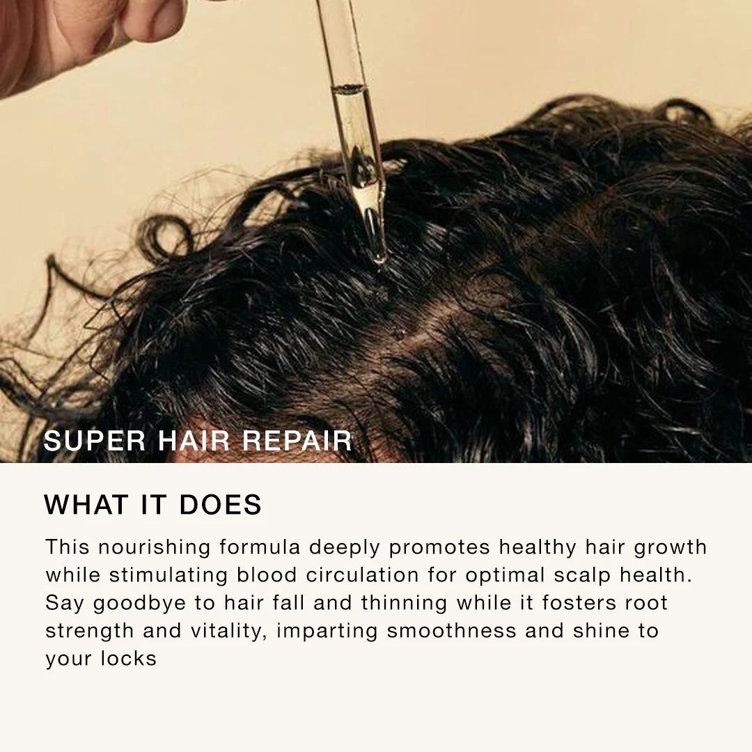 Ströme Super Hair Repair is een op olie gebaseerd hoofdhuidserum dat is samengesteld voor al uw haarproblemen, zoals haaruitval, dunner wordend haar, jeuk of milde roos. Het ondersteunt een gezonde haargroei door de bloedcirculatie en een goede hoofdhuidgezondheid te bevorderen.