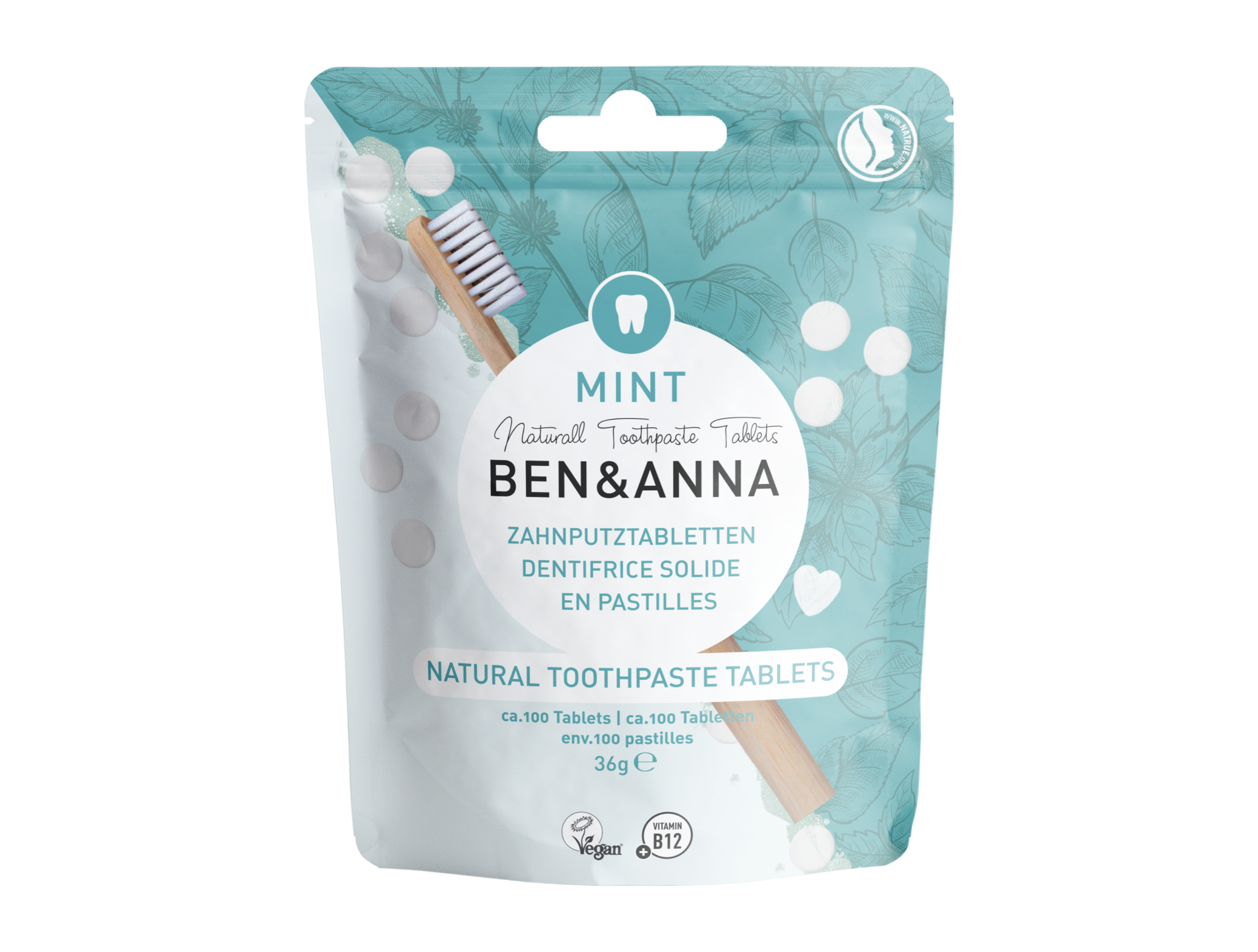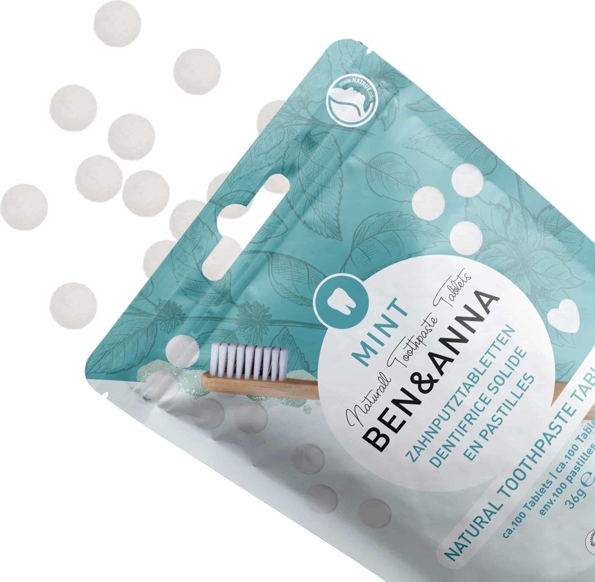 De tandenpoetstabletten van Ben en Anna zijn een gemakkelijke manier om je tanden te reinigen zonder tandenborstel. Je lost één tablet op in water en spoelt de oplossing grondig door je mond.