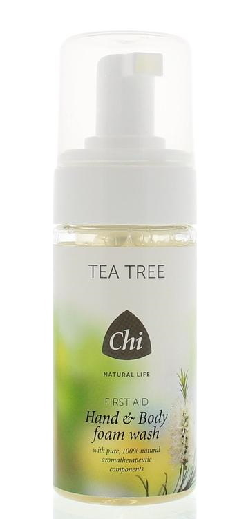 De Tea Tree Hand & Body Foam Wash van Chi is een natuurlijk, zacht reinigingsschuim (pH-neutraal) voor de reiniging van handen en lichaam. Het reinigingsschuim zuivert, bevordert de bloedcirculatie en zuivert de onreine huid. De Tea Tree Hand & Body Foam Wash ruikt heerlijk fris dankzij de toevoeging van lavendel, eucalyptus en niaouli olie. Milde tensiden reinigen de huid op zachte wijze zonder te irriteren. Biologische tea tree olie zuivert de huid en werkt antibacterieel, anti-viraal en schimmeldodend.