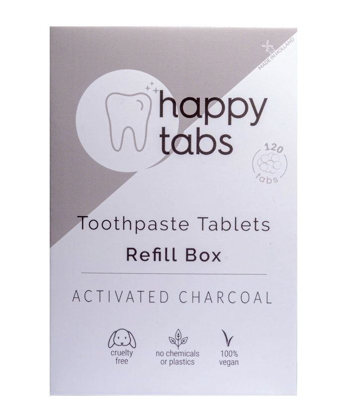 De Toothpaste Tablets Refill Box Mint Charcoal Fluoride Free van Happy Tabs is een navulverpakking voor de Toothpaste Tablets Mint Charcoal Fluoride Free. Het zijn natuurlijke tandenpoetstabletten voor gezonde, beschermde tanden. De tabletten gaan tandplak tegen en beschermt je gebit voor gaatjes. De hoge concentratie xylitol gaat de opbouw van plaque effectief tegen, waardoor je minder kans hebt op tandsteen, gaatjes en andere tandproblemen. Bovendien versterkt het de tanden en wordt het tandglazuur minder kwetsbaar. Natriumbicarbonaat neutraliseert zuren, verwijdert tandplaque en vermindert tandvleesirritatie. Deze fluoride-vrije versie is verrijkt met geactiveerde houtskool, dit houdt je tanden natuurlijk wit. De Happy Tabs zijn heel gebruiksvriendelijk en ideaal voor op reis. De tabletten zijn plasticvrij verpakt in een herbruikbare glazen pot. De Toothpaste Tablets Mint Charcoal Fluoride Free hebben een frisse muntsmaak, zijn vegan en natuurlijk dierproefvrij.