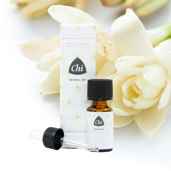 Het Tuberoos Absolue van Chi is een 100% natuurlijk en zuiver tuebroos absolue. De absolue wordt verkregen via oplosextractie van de handgeplukte bloemen. De tuberoos is ondanks de naam geen familie van de roos, maar verwant aan de hyacint. De kostbare bloem geurt vooral 's nachts met een zoete, honingachtige en bloemige geur. De tuberoos is een van de meest kostbare en gewilde bloemengeuren ter wereld. De ongelooflijke diepe, zwoele bloemengeur van de tuberoos maakt dat de olie heel geschikt is om een parfum of huid olie mee te maken: je omhult je met een intense bloemengeur. Tuberoos heeft een ontspannende werking en kan goed ingezet worden bij innerlijke onrust.