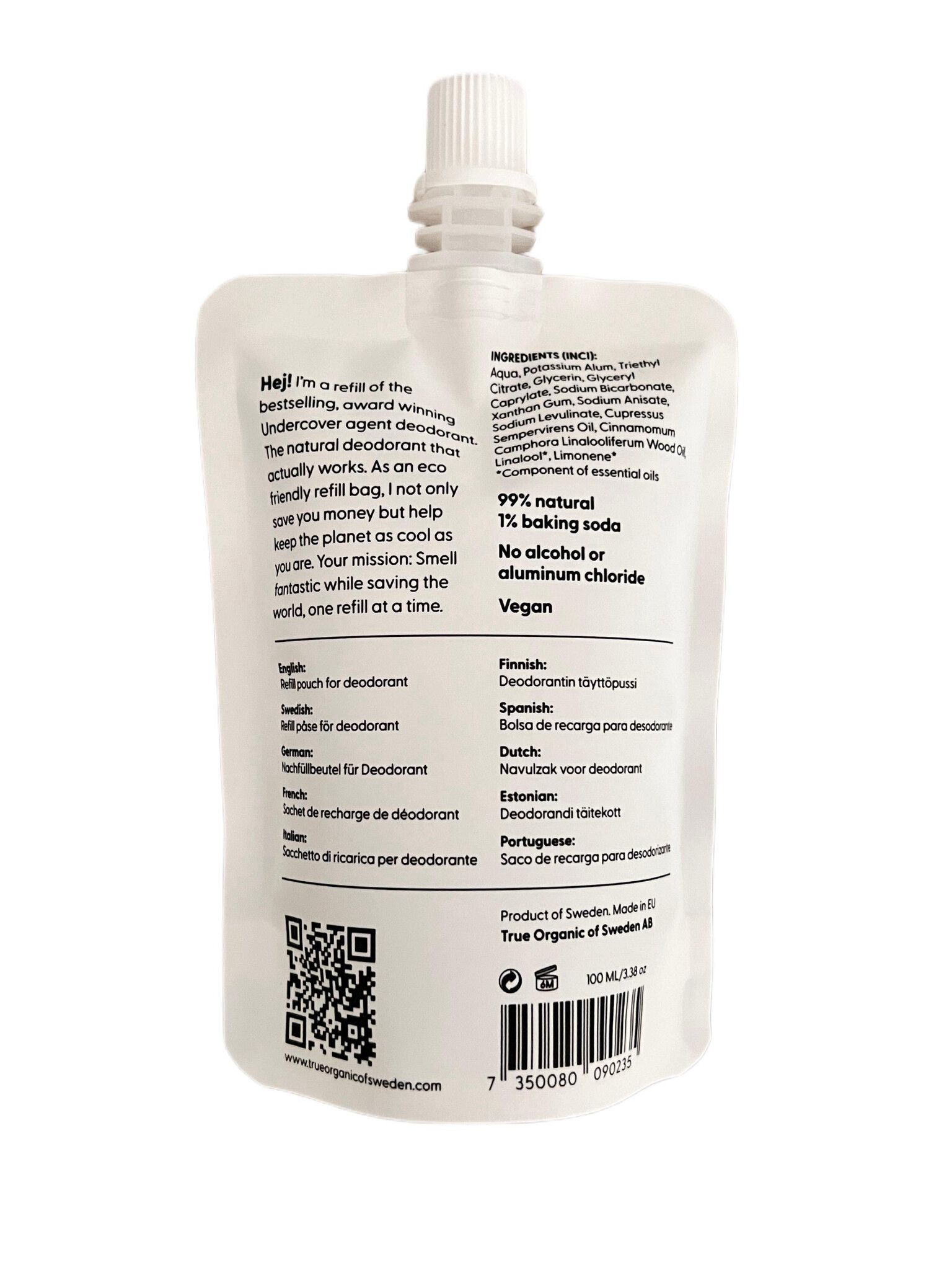 Een navulling van de best verkochte, bekroonde Undercover agent deodorant, originele geur. Undercover agent, de natuurlijke deodorant die echt werkt. In een milieuvriendelijk navulzakje, het bespaart je niet alleen geld, maar helpt ook de planeet net zo cool te houden als jij. Jouw missie: Ruik fantastisch terwijl je de wereld redt, één navulling per keer.