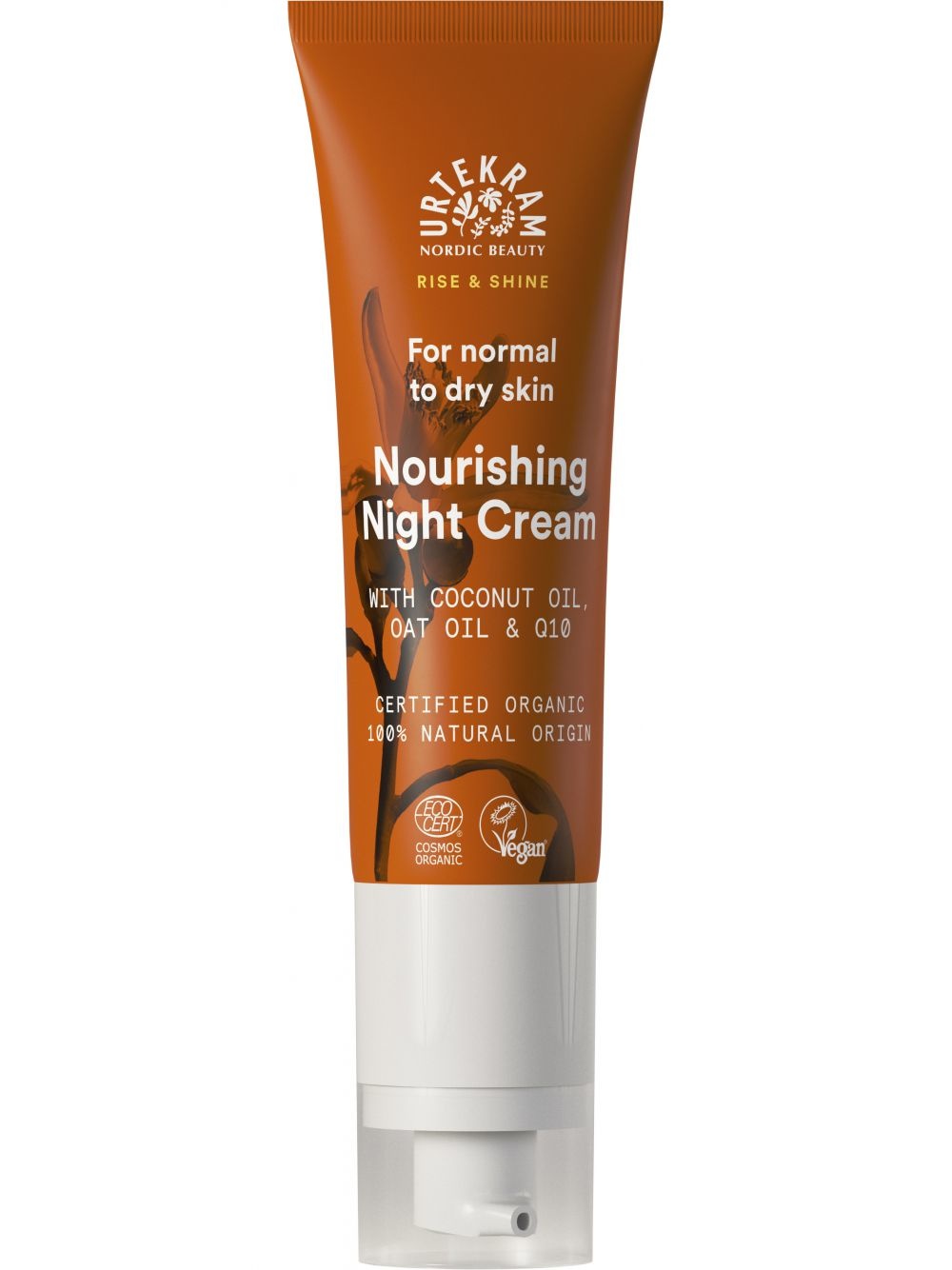 De Rise & Shine Nourishing Night Cream van Urtekram is een natuurlijke nachtcrème die de huid verzorgt, voedt en hydrateert. De hoge concentratie aloë vera hydrateert, kalmeert en stimuleert het huidherstel. Sheabutter voedt intensief, zorgt voor een zachte, gladde huid en beschermt tegen invloeden van buitenaf. Zoete amandelolie, kokosolie en jojoba olie voeden en hydrateren de huid en zorgen voor een veerkrachtige, soepele huid. Haverolie is rijk aan ceramiden, antioxidanten en vitamine E. Het verzacht, bevordert de huidelasticiteit en -stevigheid en geneest de geïrriteerde, ontsteken en schilferige huid. Q10 is een krachtige antioxidant, vermindert rimpels en zorgt voor een stevigere huid. Hyaluronzuur bindt vocht en zorgt voor een gladdere, vollere huid. Bevat verder o.a. sinaasappelolie, vitamine E en magnolia extract. De crème verzorgt de huid gedurende de nacht en zorgt ervoor dat je wakker wordt met een gladde, stralende teint. De Rise & Shine Nourishing Night Cream is speciaal geschikt voor de normale tot droge huid.