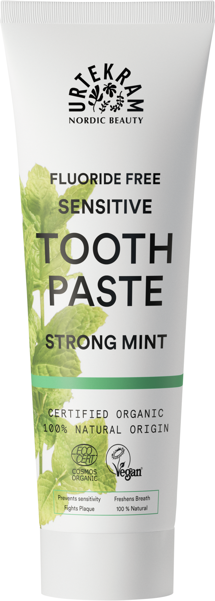 De Strong Mint Sensitive Toothpaste van Urtekram is een 100% natuurlijke tandpasta zonder sulfaten, conserveringsmiddelen of fluoride. Het brengt de mondflora in evenwicht en versterkt gevoelige tanden. Calciumcarbonaat verwijdert tandplaque, voedselresten en aanslag van o.a. koffie en thee. Xylitol gaat de opbouw van plaque tegen, waardoor je minder kans hebt op tandsteen, gaatjes en andere tandproblemen. Bovendien versterkt het de tanden en wordt het tandglazuur minder kwetsbaar. Biologisch aloë vera extract herstelt het evenwicht in de mond, vermindert tandplaque en verzacht ontstekingen. Zoethoutwortel zorgt voor een gezonde mondflora, werkt ontstekingsremmend en verzachtend. Pepermunt zorgt voor een frisse adem en geeft de tandpasta een verfrissende smaak.