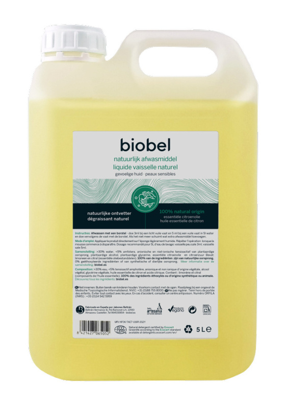 Effectief ecologisch afwasmiddel, geparfumeerd met essentiële citroenolie, dat op natuurlijke wijze reinigt, vet verwijdert en alle soorten keukengerei poetst.