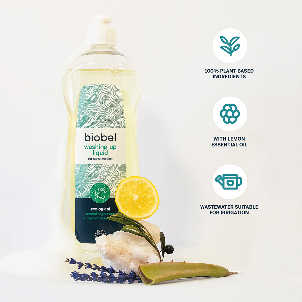 Effectief ecologisch afwasmiddel, geparfumeerd met essentiële citroenolie, dat op natuurlijke wijze reinigt, vet verwijdert en alle soorten keukengerei poetst.
