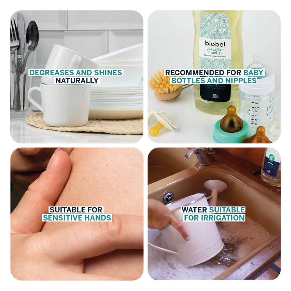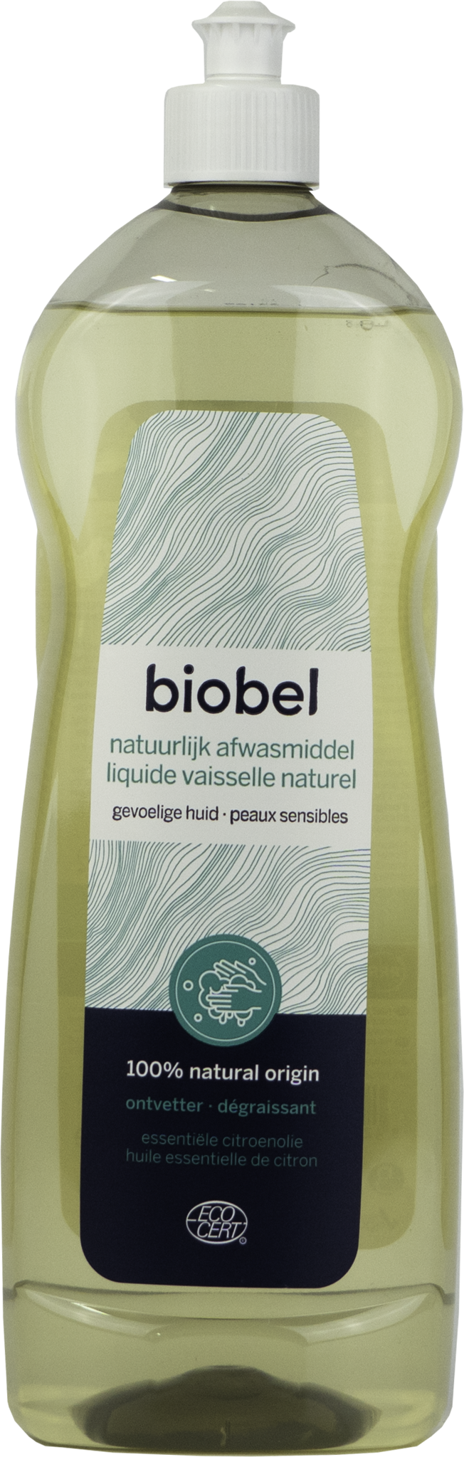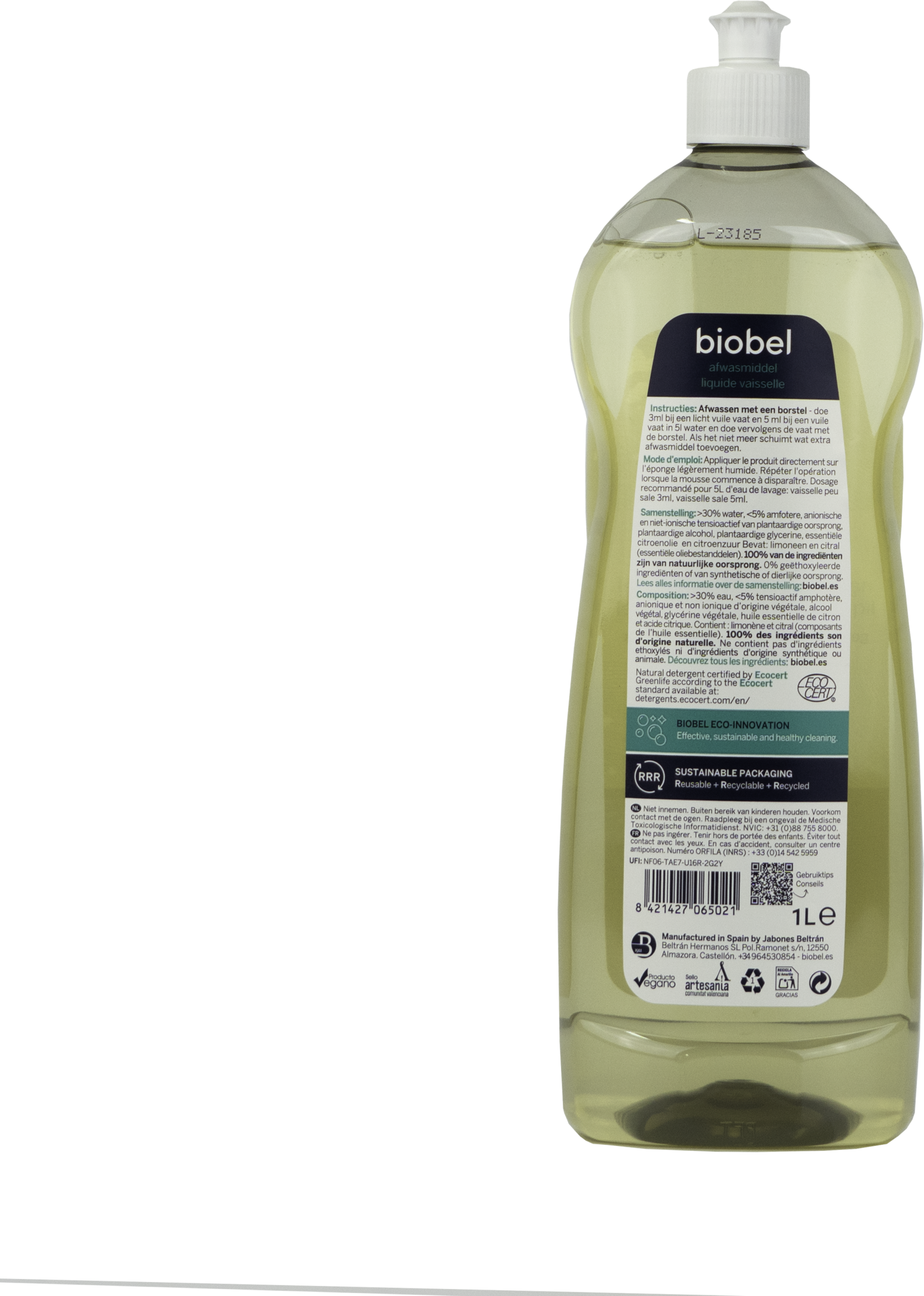 Effectief ecologisch afwasmiddel, geparfumeerd met essentiële citroenolie, dat op natuurlijke wijze reinigt, vet verwijdert en alle soorten keukengerei poetst.