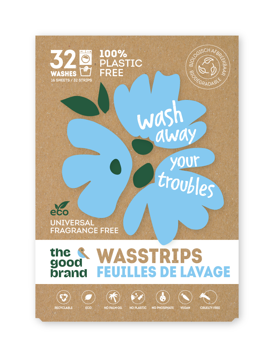 Met The Good Brand plasticvrije wasstrips bespaar je bergen plastic afval. Je vermindert ook nog eens de CO2 uitstoot doordat het onnodig vervoer van water (gewicht) gereduceerd is naar zero! Dat vermindert het gebruik van brandstof en de daaruit voortvloeiende koolstof emissies met maar liefst 94%. En het sjouwen met zware flessen is ook verleden tijd.