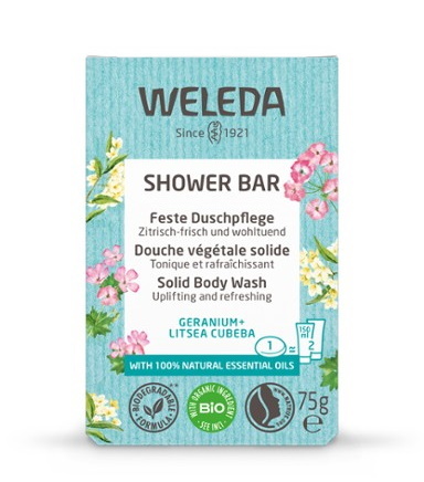 De Shower Bar Geranium + Litsea Cubeba van Weleda is een opwekkende en verfrissende vaste douchegel. De Shower Bar is de ideale combinatie tussen een duurzaam moment en een heerlijke wellness-ervaring. Voel je levendig en verfrist als de geur van geranium en litsea cubeba je omhult. De geur van 100% natuurlijke etherische oliën komt tot leven onder de douche en zorgt voor een opbeurende en vrolijke traktatie voor lichaam en geest. Etherische geranium olie werkt geruststellend en versterkend. Etherische litsea cubeba olie heeft en verfrissende en verkwikkende werking en bevordert de concentratie. De biologisch afbreekbare formule van 100% natuurlijke ingrediënten reinigt mild en de romige zeep verrijkt met biologische shea butter en plantaardige glycerine verzorgt je huid. De huidverdraagzaamheid van deze body bar is dermatologisch bewezen. De Shower Bar Geranium + Litsea Cubeba is vegan.