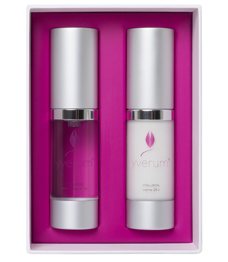 Het Hyaluron Facial Care Set van Yverum bevat het Hyaluron Anti-Aging Serum (15ml) en de Hyaluron Crème 24h (15ml).